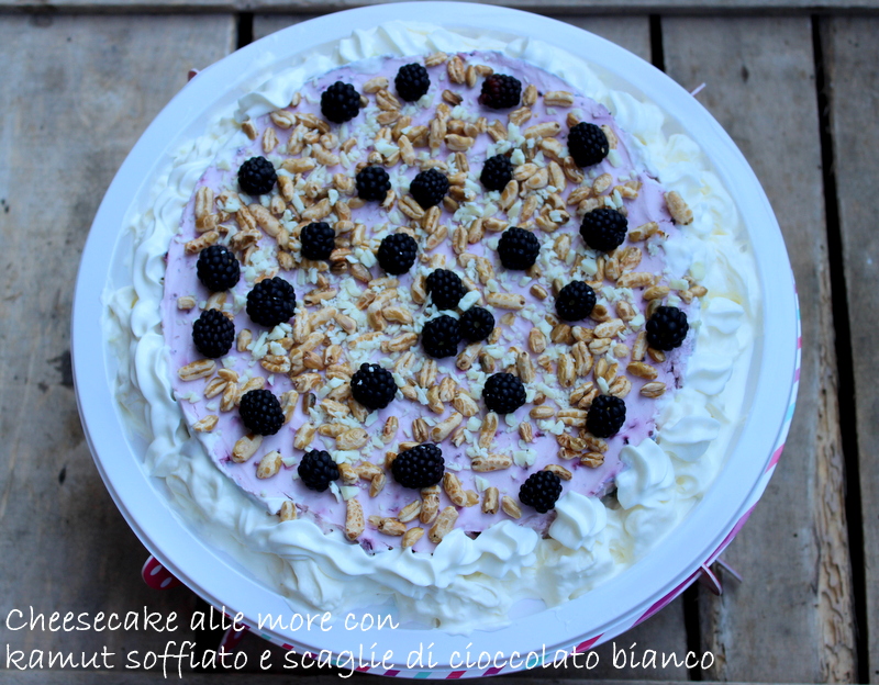 Cheesecake more e kamut soffiato con scaglie di cioccolato bianco