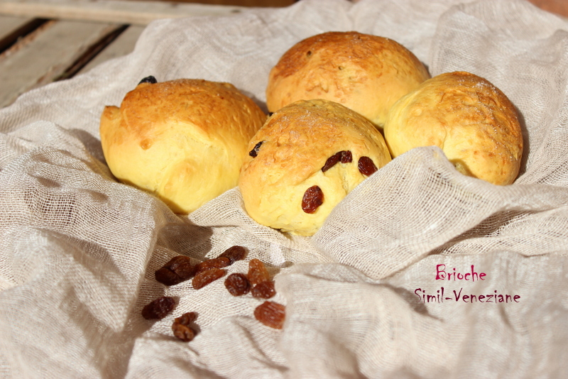 La pasta base è quella del pan brioche che mi hanno insegnato al corso di cucina sui lievitati a cui io ho aggiunto l’uvetta e cercato di riprodurre le buonissime veneziane che piacciono tanto a mia madre e di cui purtroppo non riusciamo più a trovare la ricetta che utilizzava mio nonno quando aveva la pasticceria.