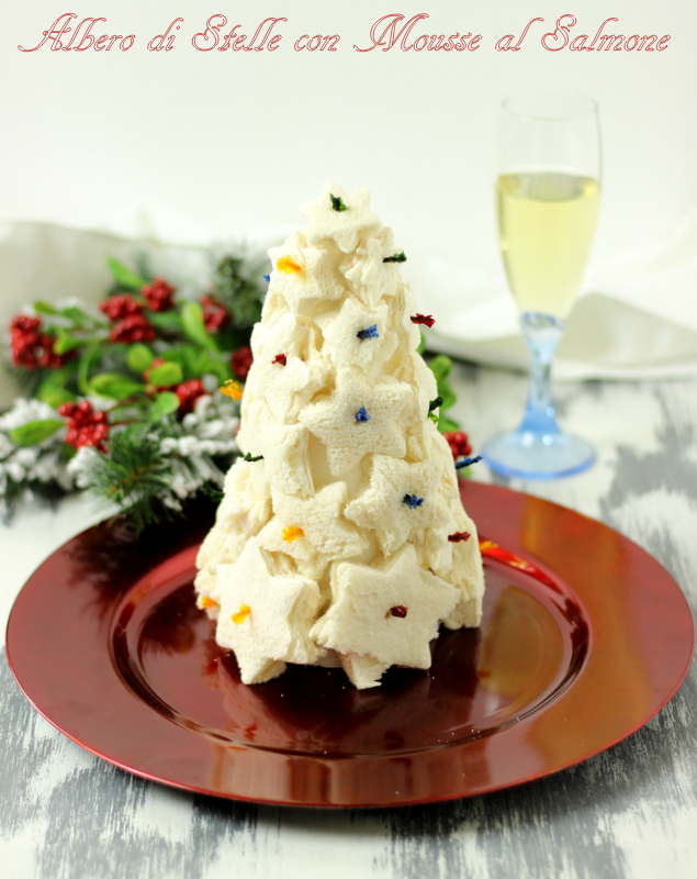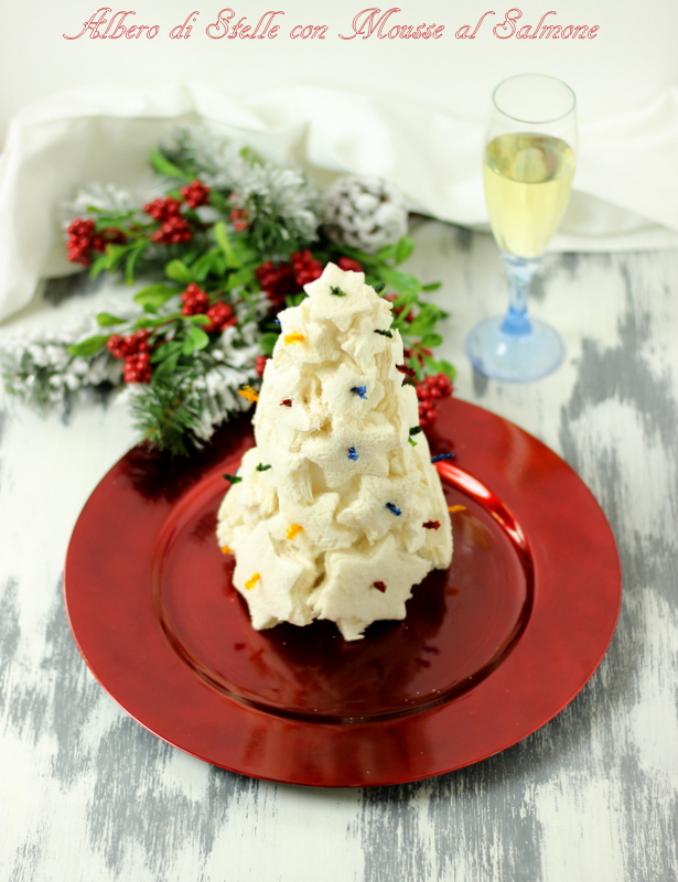 Ho farcito le mie stelline con una buonissima mousse al salmone affumicato che ormai accompagna quasi ogni antipasto a tema natalizio e mi sono divertita a vestire a festa un semplicissimo cono di polistirolo.
