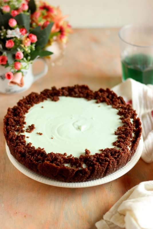 Versate la crema alla menta sulla base di biscotti e livellate la superficie.