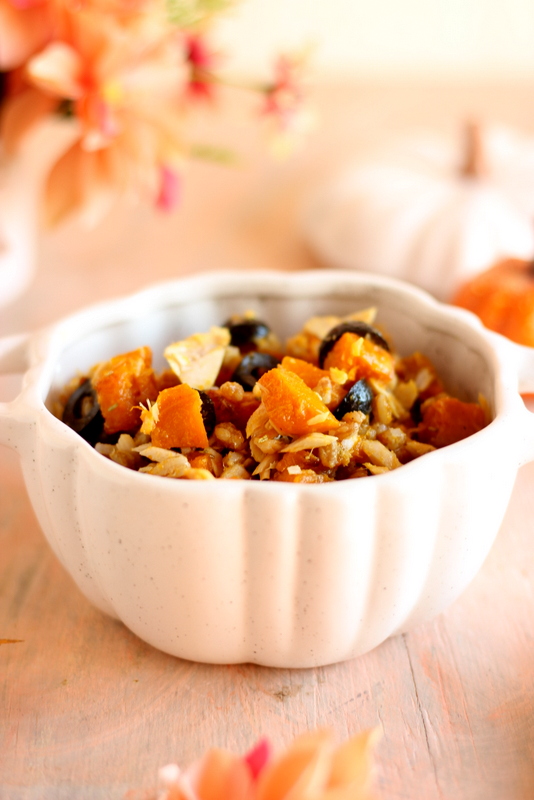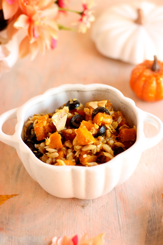 Il farro, con la sua consistenza soda e il suo sapore rustico, si sposa alla perfezione con la dolcezza della zucca e il gusto deciso dello sgombro, mentre le olive aggiungono una nota sapida che bilancia tutto in modo armonioso.
