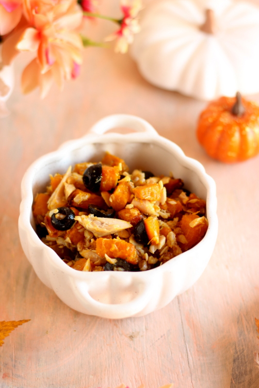 In una ciotola capiente unite il farro freddo, la zucca cotta, le olive tagliate a pezzetti e lo sgombro sgocciolato.